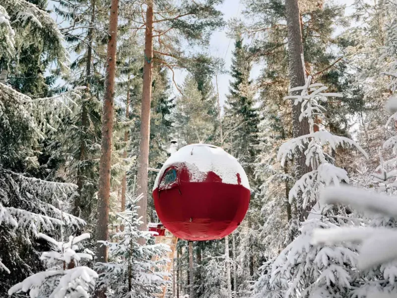 La enorme esfera roja suspendida de los pinos en Näsets Marcusgård, una antigua granja, no es una decoración navideña, sino una "tienda de campaña en un árbol" hecha con una estructura de aluminio y contrachapado, recubierta con una lona impermeable.