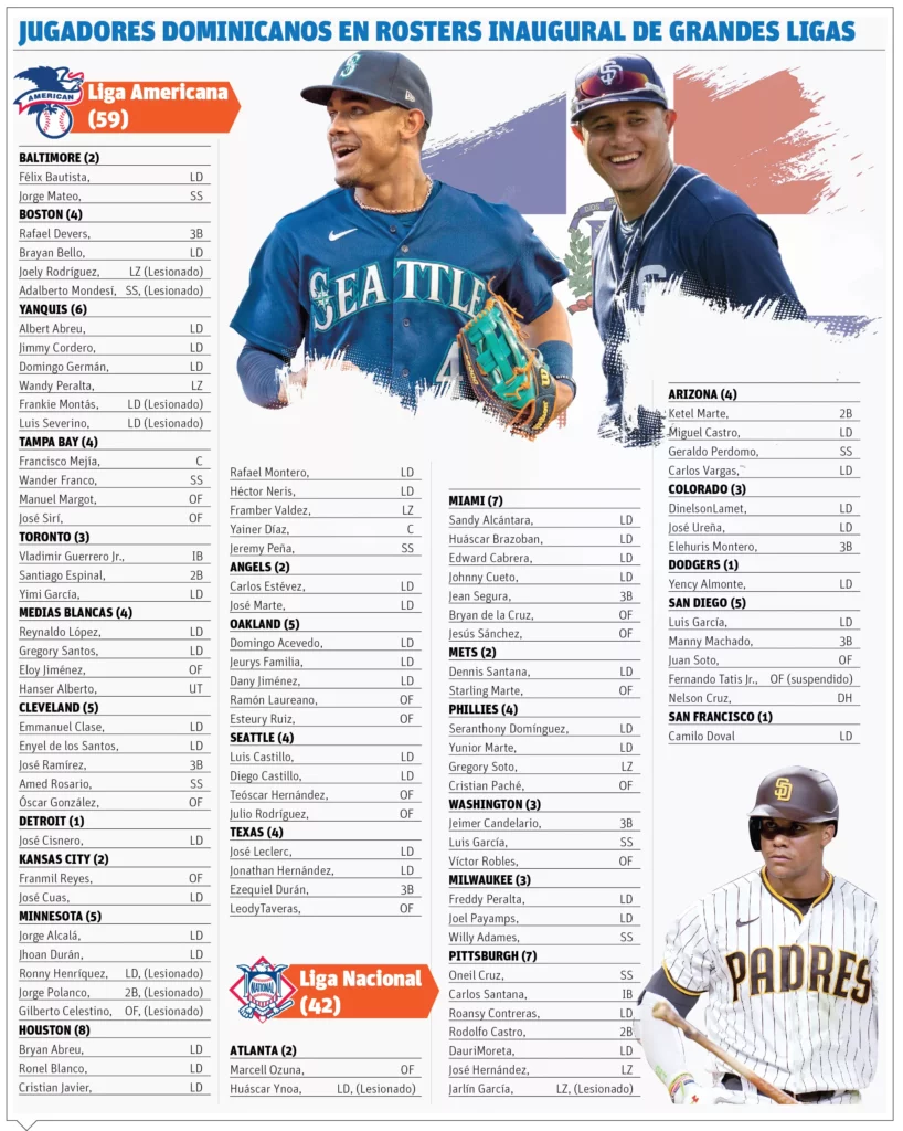 SANTO DOMINGO.-Un total de 101 jugadores dominicanos (59 en la Liga Americana y 42 en la Nacional) estarán en las nóminas de 27 equipos de los 30 para la apertura de hoy en las Grandes Ligas. Aunque en ese grupo se incluyen a nueve que están en la lista de incapacitados y uno suspendido.