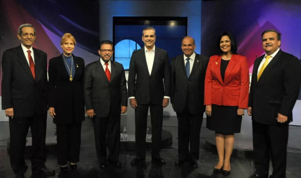 El ausente en el debate fue el presidente Danilo Medina. Los presentes fueron Guillermo Moreno de Alianza País, Luis Abinader, del Partido Revolucionario Moderno; Minerva Tavárez Mirabal, de Alianza por la Democracia; Hatuey Decamps, del Partido Revolucionario Social Demócrata; Pelegrín Castillo, de la Fuerza Nacional Progresista; Elías Wessin Chávez, del Partido Quisqueyano Demócrata, y Soraya Castillo, del Partido de la Unidad Nacional.