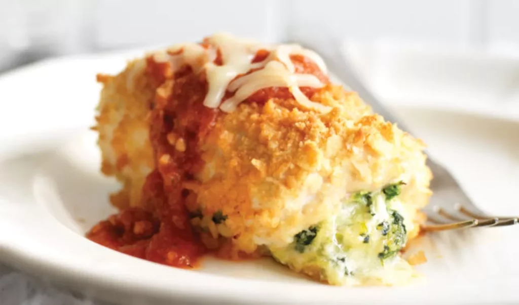 Mezclar bien el queso crema, la espinaca, 1 taza del mozzarella y 3 cucharadas del parmesano; esparcir la mezcla sobre las pechugas de pollo previamente sazonadas.