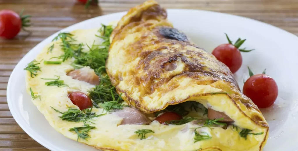 Vuelva a poner aceite de oliva para cocinar y luego vierta las claras de huevo. Cuando los bordes estén ligeramente marrones, agregar las verduras y por último el jamón. Para finalizar ponga el queso, mientras junta los lados para formar el omelette. Sirva y acompañe a su gusto.