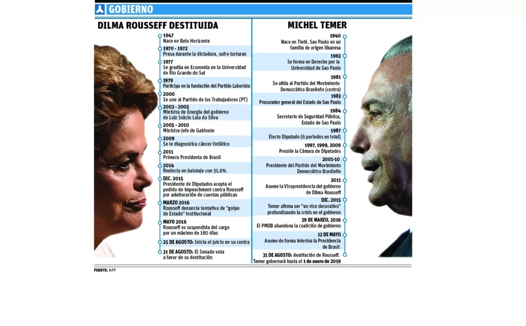 Ella fue la primera mujer en ejercer la presidencia de Brasil, con una destacada carrera que incluyó formar parte de la lucha guerrillera en la década de 1970 y ser encarcelada y torturada por la dictadura de entonces. El año pasado fue acusada de violar las leyes fiscales para ocultar agujeros en el presupuesto federal, y argumentan que ello exacerbó la recesión, la inflación y los despidos.