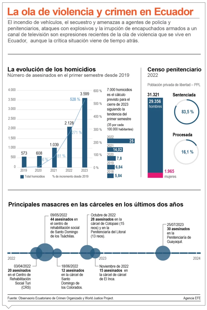 Guterres “está muy alarmado por el deterioro de la situación en el país así como por el impacto disruptivo en las vidas de los ecuatorianos”, “condena los actos criminales de violencia” y “envía un mensaje de solidaridad a los ecuatorianos”, dijo su portavoz, Stéphane Dujarric, en su rueda de prensa diaria en Nueva York.