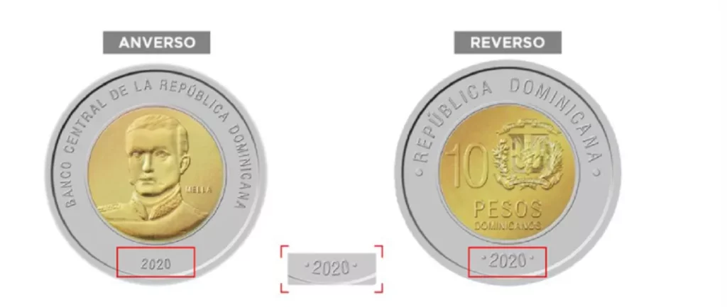 La moneda de RD$10.00, año 2020, en el anverso tiene el nombre del Banco Central de la República Dominicana y abajo la cara del Padre de la Patria Matías Ramón Mella, mientras que en el reverso mostrará la inscripción PESOS DOMINICANOS debajo del Escudo Nacional, en cumplimiento del mandato constitucional que indica que la unidad monetaria nacional es el PESO DOMINICANO.