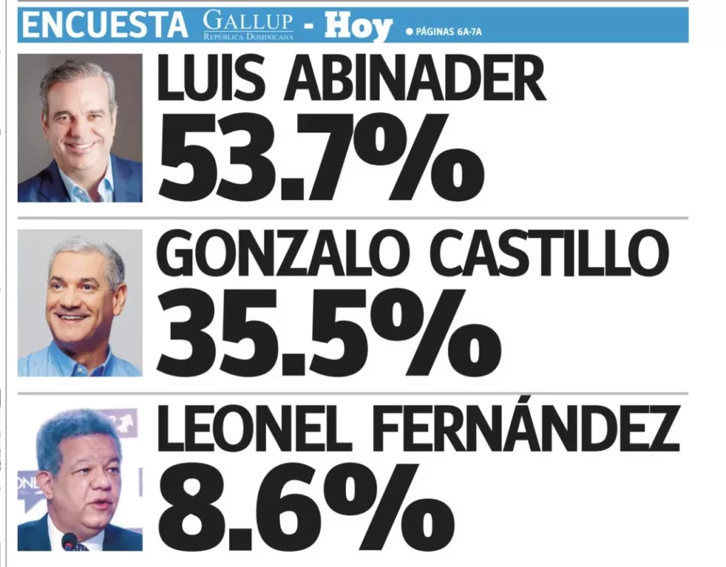 Abinader 53.7%, Gonzalo 35.5% y Leonel 8.6%, según encuesta Gallup-HOY