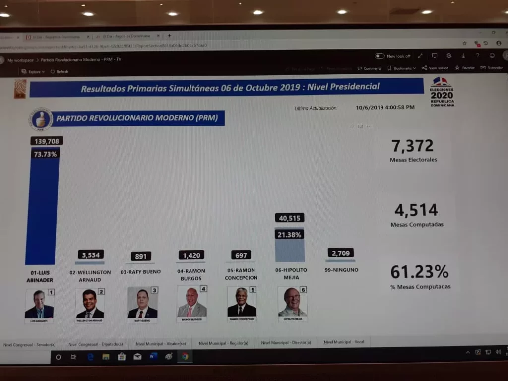 SANTO DOMINGO.– Con el 61.23% de las mesas computadas, el precandidato presidencial del Partido Revolucionario Moderno (PRM) Luis Abinader mantiene una amplia ventaja sobre el expresidente Hipólito Mejía.