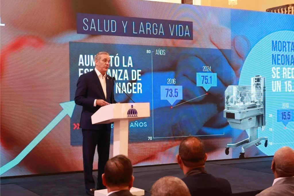 Abinader destacó el impacto del programa Más Salud, Más Esperanza de Vida, basado en la estrategia Hearts, que brinda tratamiento gratuito y de última generación a pacientes con hipertensión y diabetes, beneficiando ya a 400,000 personas y proyectando llegar a 1.2 millones. La red hospitalaria se amplió con 90 hospitales remozados o construidos, 625 centros de atención primaria y un aumento del personal médico y de enfermería por cada 100,000 habitantes.