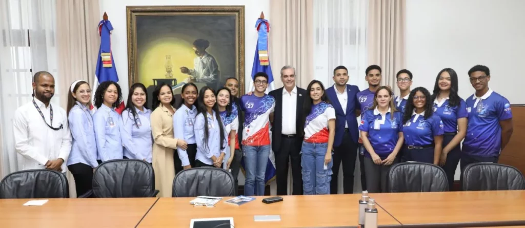Santo Domingo. – El presidente Luis Abinader recibió en el Palacio Nacional a 12 estudiantes de los niveles universitario y secundario que participan en el concurso anual NASA Human Exploration Rover Challenge, que organiza la Administración Nacional de Aeronáutica y el Espacio (NASA).