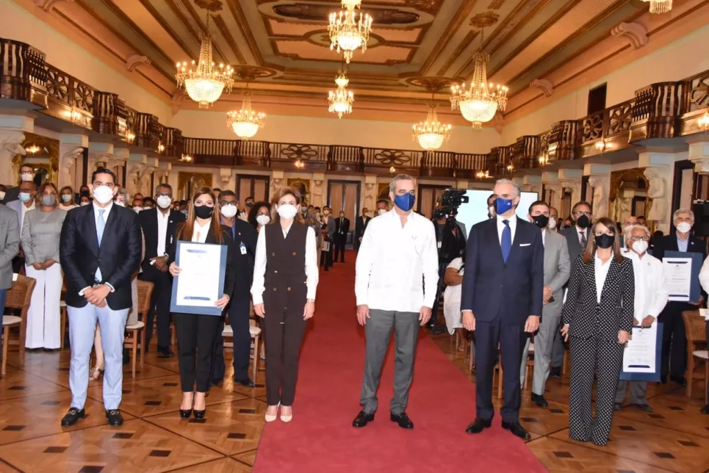 Santo Domingo. El presidente de la República, Luis Abinader, junto al ministro de Trabajo Luis Miguel De Camps García, entregó los certificados que validan el cumplimiento del protocolo de prevención del Covid-19 al sector turismo.