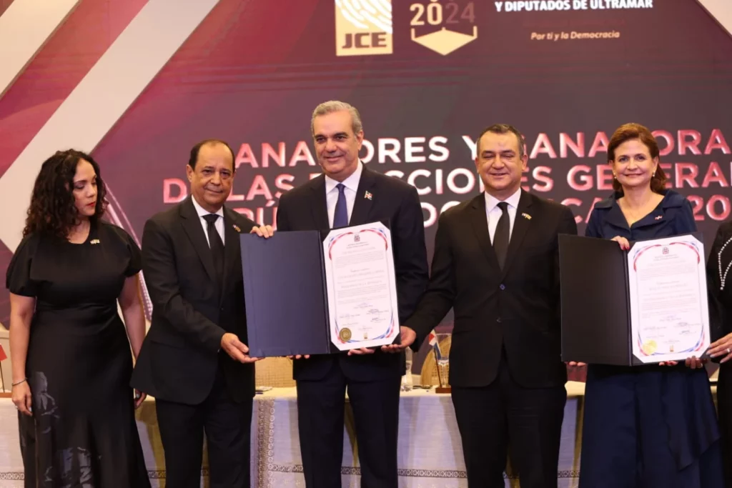 Santo Domingo.- El presidente Luis Abinader y la vicepresidenta Raquel Peña recibieron este jueves sus certificados que los acreditan como ganadores de las elecciones generales presidenciales y congresuales del pasado 29 de mayo, por parte de la Junta Central Electoral (JCE).