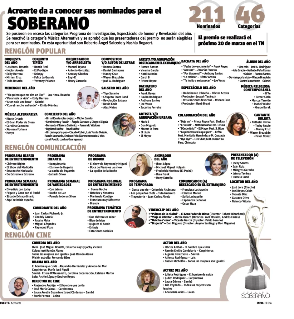Santo Domingo.- La Asociación de Cronistas de Arte (Acroarte) anunció este lunes los nominados a la 34 entrega anual de los Premios Soberanos, el reconocimiento artístico más importante que enaltece la excelencia en el campo de las artes clásicas, la música, la televisión y el cine.