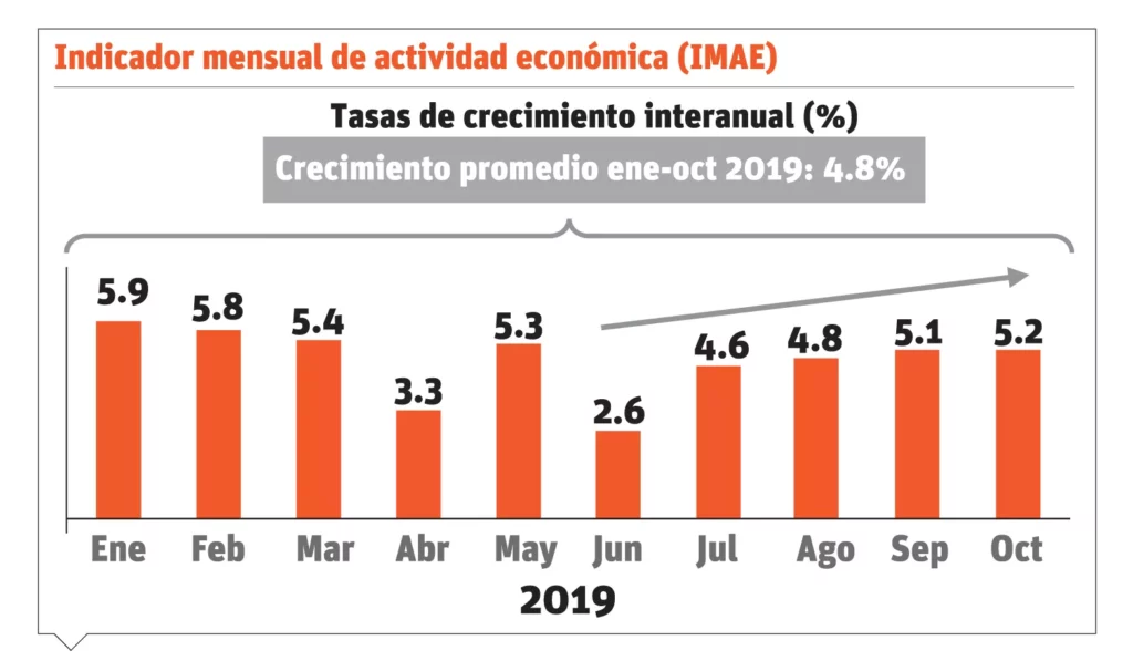En octubre de 2019, el mismo se encuentra sustentado principalmente en el incremento experimentado en el valor agregado real de las siguientes actividades económicas: Construcción (14.9%), Explotación de Minas y Canteras (10.4%), Energía y Agua (7.6%), Otras Actividades de Servicios (7.3%), Servicios Financieros (6.7%), Actividades Inmobiliarias (5.1%), Transporte y Almacenamiento (4.4%) y Agropecuaria (4.3%).