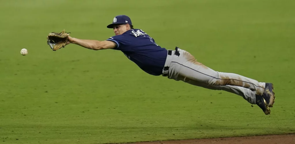 En el primer juego de la serie, con los Rays abajo 1-0 en la cuarta entrada Blake Snell había permitido que dos corredores llegaran antes de que Kyle Tucker conectara una línea por el medio … justo en el guante de espera de Adames, quien luego dobló Alex Bregman que había salido para la segunda.