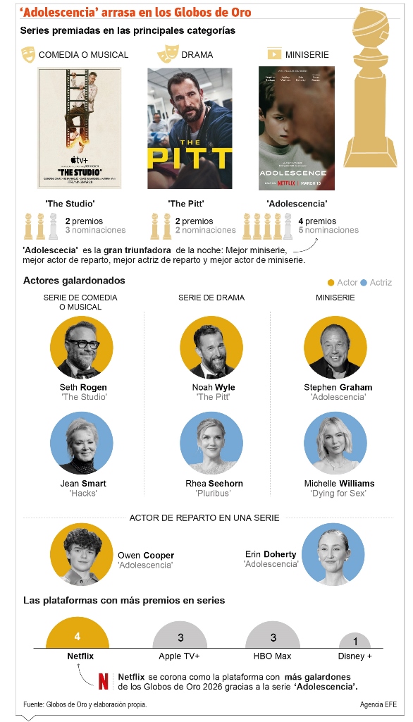 Santo Domingo.-El fenómeno de Netflix 'Adolescence' conquistó este domingo los Globos de Oro en los apartados de televisión, logrando cuatro premios, seguido del drama médico 'The Pitt' y la comedia 'The Studio', que acumularon dos galardones cada uno.