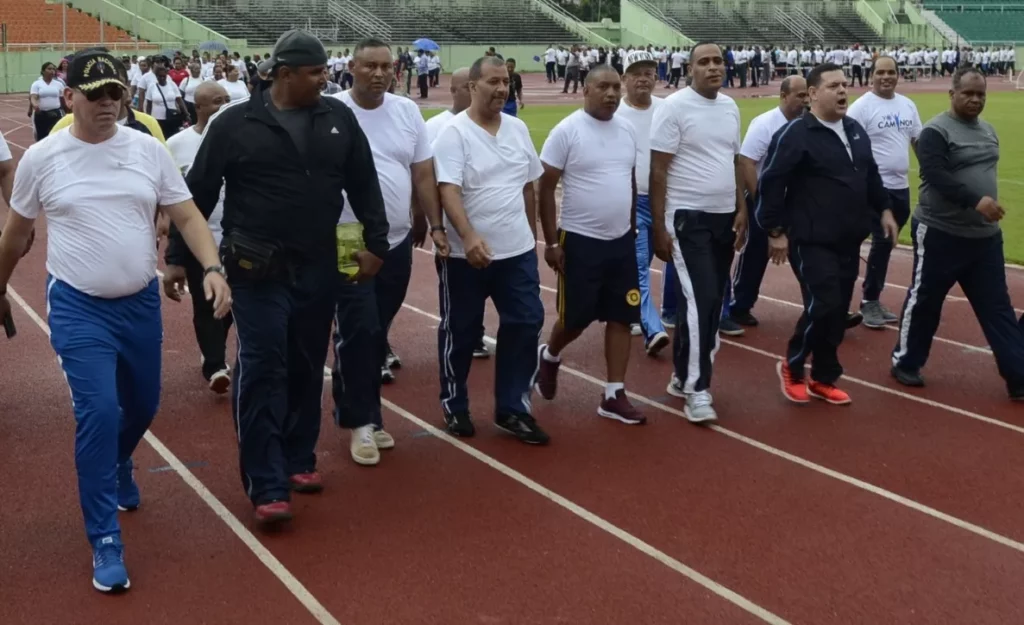 Los uniformados de diferentes rangos, edades y sexo recibieron las instrucciones de calentamiento y caminata por parte del mayor de la Policía y medallista Olímpico Gabriel Mercedes.