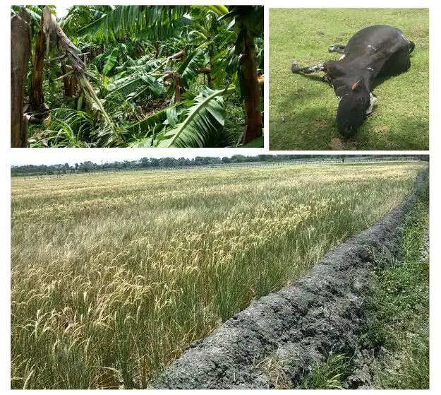 Los siniestros se produjeron en los cultivos de arroz, cebolla, maíz, habichuelas, guandules, batata, yuca, chinola, y cacao, además de siniestros de ganado e invernaderos.
