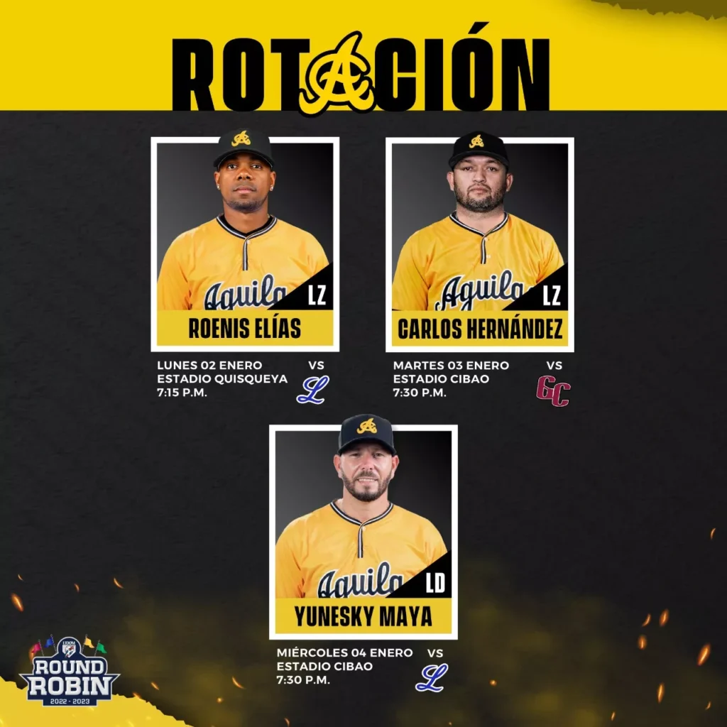 SANTIAGO.- Las Águilas Cibaeñas anunciaron su rotación de abridores para los próximos tres partidos de la semana, liderada por el cubano Roenis Elías, quien se mide este lunes 2 a los Tigres del Licey en el Estadio Quisqueya Juan Marichal, en la reanudación de la serie semifinal luego del asueto del fin de año.
