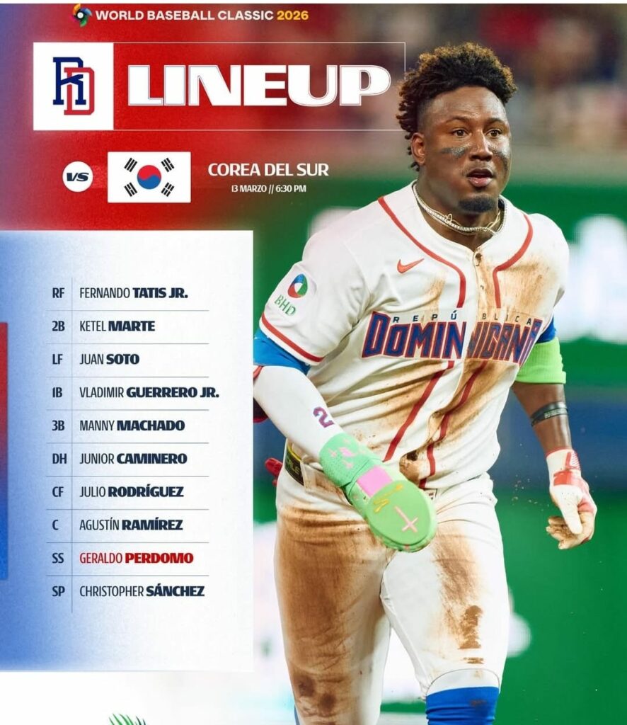 Según la alineación, Fernando Tatis seguirá de primer bate y en el jardín derecho, Ketel Marte, segundo (2B), Juan Soto, tercero (LF), Manny Machado, cuarto (3B), Vladimir Guerrero Jr, quinto (1B), Junior Caminero, sexto (DH), Julio Rodríguez, séptimo (CF), Agustin Ramirez, octavo (C), Geraldo Perdomo, noveno (SS).