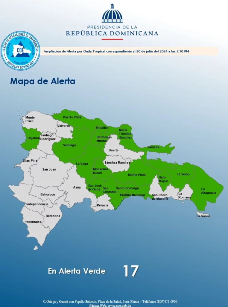 Santo Domingo.- El Centro de Operaciones de Emergencias (COE), elevó a 17 las provincias en alerta verde debido al paso de una onda tropical y la incidencia de una vaguada sobre el territorio nacional.