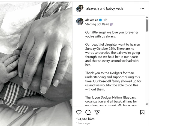 "Gracias a la afición de los Dodgers, a la organización de los Azulejos y a todos los fanáticos del béisbol por su cariño y apoyo", escribieron los Vesia en Instagram. "Hemos visto todos sus mensajes, comentarios y publicaciones. Nos han brindado mucho consuelo".