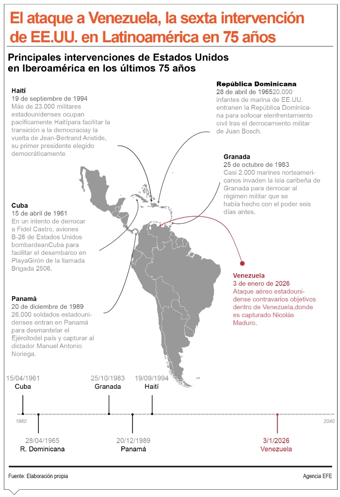 De su lado, la presidenta de México, Claudia Sheinbaum, urgió ayer a las Naciones Unidas (ONU) y la Organización de los Estados Americanos (OEA) a “garantizar” la soberanía nacional y “la autodeterminación de los pueblos” tras la intervención militar de Estados Unidos en Venezuela.