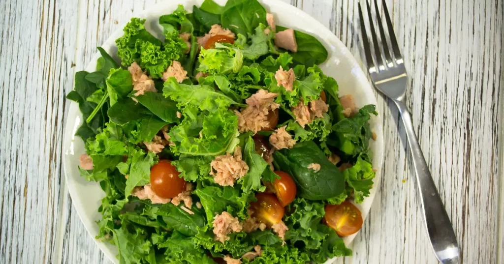 En un plato coloque un lecho de hojas de espinacas frescas, ponga el atún en el centro del plato, decorar con el resto de la lechuga, sazonar y servir a su gusto.