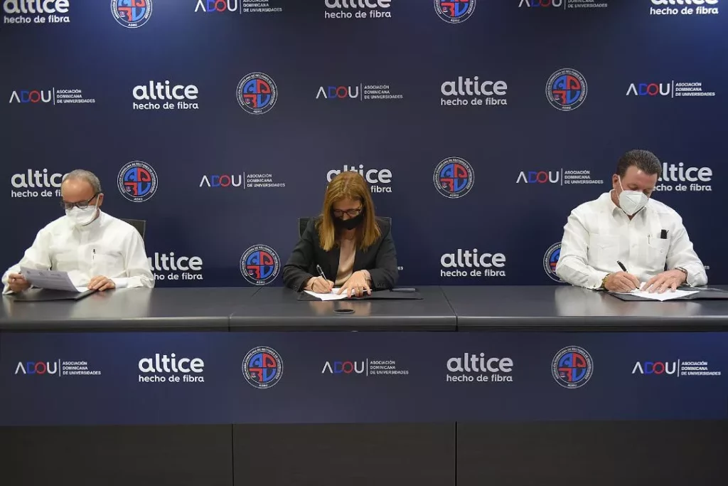 La empresa de telecomunicaciones Altice Dominicana firmó este miércoles un convenio con la Asociación Dominicana de Universidades (ADOU) y la Asociación Dominicana de Rectores de Universidades (ADRU), con el objetivo de propiciar espacios educativos a distancia al proveer conectividad a más de 600 mil estudiantes y a 30 mil docentes de las 51 universidades de todo el país.