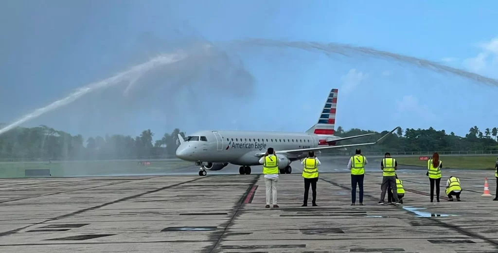 SANTO DOMINGO.- American Airlines y Aeropuertos Dominicanos (AERODOM) celebraron conjuntamente la llegada al Aeropuerto Internacional Presidente Juan Bosch El Catey en Samaná (AZS) del primer vuelo procedente de la ciudad de Charlotte Douglas (CLT) de los Estados Unidos, como parte del nuevo destino que se apertura para la región noreste del país.