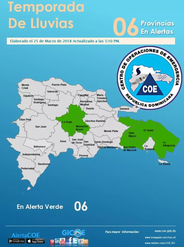 Santo Domingo.- El nivel de alerta verde fue ampliado esta tarde para seis provincias por posibles inundaciones repentinas, desbordamientos de ríos, arroyos y cañadas, así como, deslizamientos de tierra, según informó el Centro de Operaciones de Emergencias (COE).