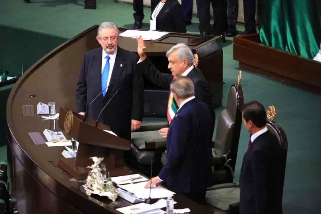 López Obrador, quien será presidente de 2018 a 2024, recibió la banda presidencial de manos de Muñoz Ledo, presidente de la Cámara de Diputados y uno de los padres de los movimientos de izquierda en México al separarse en 1988 del Revolucionario Institucional (PRI), el partido de Peña Nieto.
