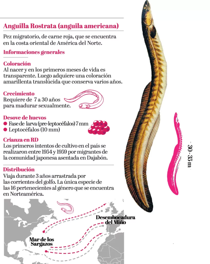 SANTO DOMINGO.-Por ser especies acuáticas catádromas y muy dinámicas, las anguillas hacen vida en agua dulce y se aparean en las salobres, particularmente en el mar de Los Sargazos, océano Atlántico, entre las islas Bermudas, Barbados y Estados Unidos.