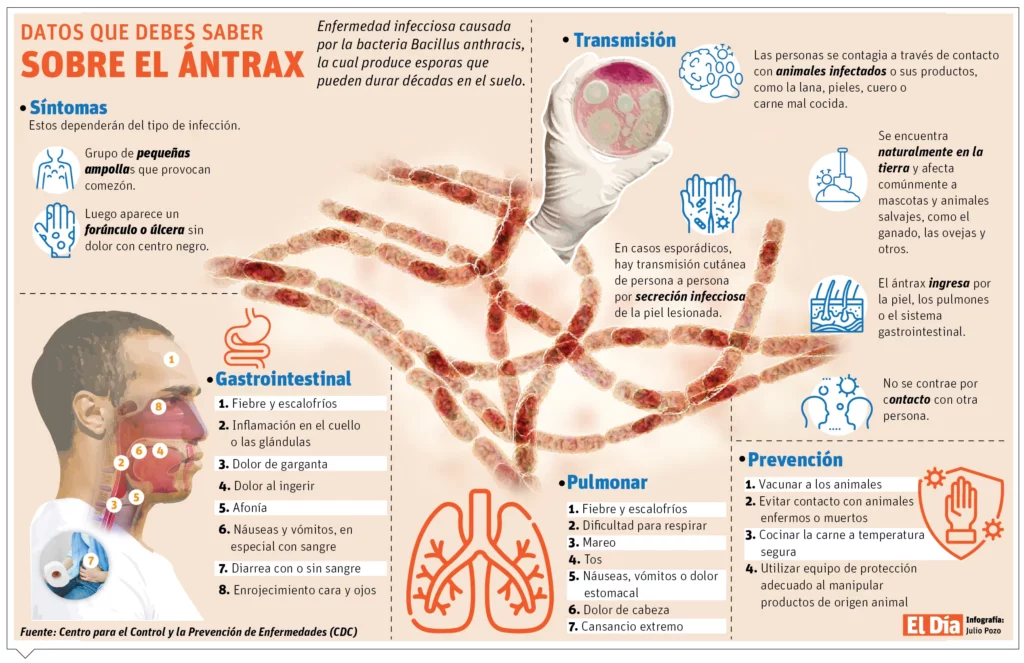 Balcácer subrayó que las otras formas de presentación de ántrax son las más temidas: la gastrointestinal y la pulmonar. La primera es la más mortal y se da por el consumo de productos contaminados con la bacteria, ocasionando hemorragias en el tracto digestivo, lo que puede llevar a la muerte.