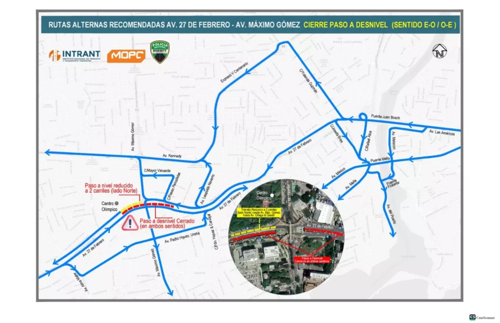 Como primera medida, en la Avenida 27 de Febrero, entre la Máximo Gómez y la Ortega y Gasset (tramo ubicado frente al Centro Olímpico), quedan habilitados solo dos de tres carriles, en dirección Este-Oeste.