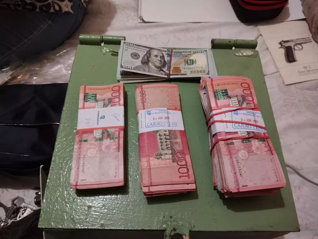 También tres pistolas, una HS-2000 y dos Glock, una calibre nueve milímetros y otra calibre .40, con sus cargadores y varias cápsulas, trituradoras, una máquina de contar dinero, prendas, RD$ 1,201,365 pesos dominicanos, US$ 35,569 dólares estadounidenses, 1,250 euros, entre otras evidencias.