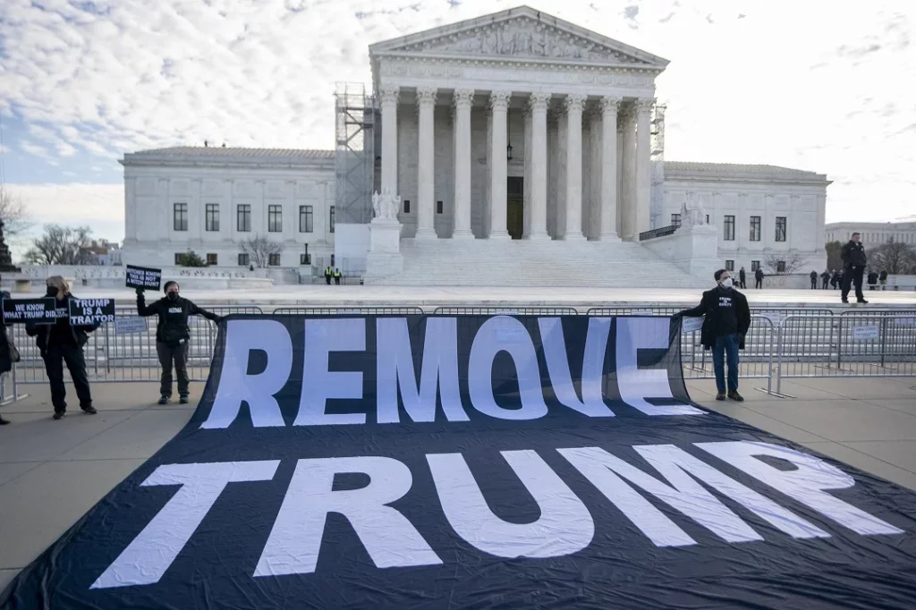 En un fallo sin precedentes, la Justicia de Colorado determinó en diciembre que la Enmienda 14 de la Constitución de EE.UU. inhabilita al republicano por la “insurrección” del asalto al Capitolio, cuando una horda de trumpistas atacó el Congreso para intentar frenar la ratificación de la victoria de Biden. Bajo el mismo argumento, las autoridades electorales de Maine también expulsaron a Trump de las primarias. Además, varios activistas y organizaciones han presentado demandas similares en al menos 11 estados y están pendientes de que el Supremo se pronuncie. En el centro del debate se encuentra la Sección 3 de la Enmienda 14 de la Constitución.