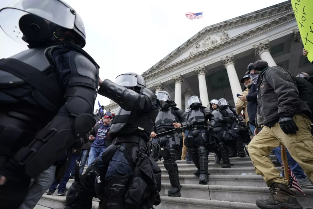 Mientras caía la noche, los agentes de la ley se abrían paso hacia los manifestantes, usando granadas aturdidoras para intentar despejar la zona alrededor del Capitolio.