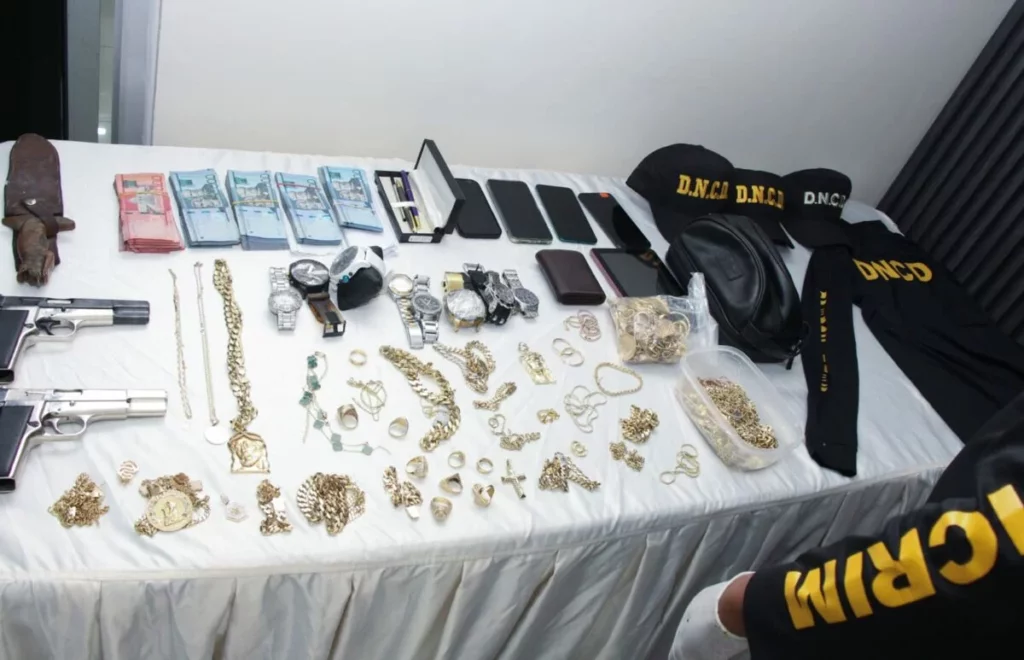 Finalmente, en un allanamiento en una joyería en el Ensanche Ozama, Santo Domingo Este, las autoridades incautaron 52 cadenas, 24 anillos, 32 guillos, 18 argollas, 65 medallas y cuatro aretes, todas de color dorado y con un peso aproximado de 1,931.02 gramos. Se siguen ampliando las investigaciones del caso.