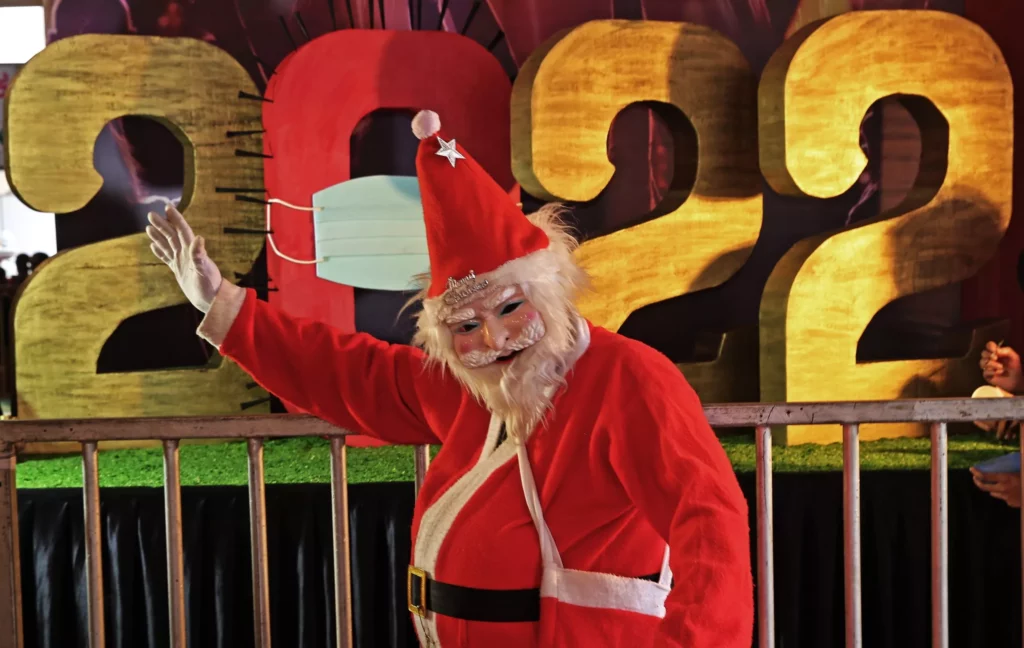 Un hombre vestido con un disfraz de Papá Noel y una máscara posa frente a un pastel '2022', una escultura comestible elaborada con ladrillos de azúcar y pasta de azúcar durante la 47a Exposición Anual de Pasteles en Bangalore , India, 27 de diciembre de 2021.