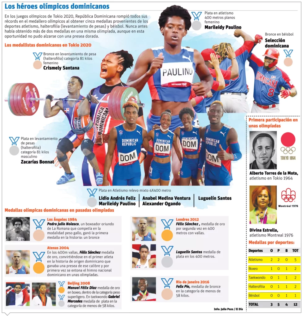 Tras estas cinco medallas, la mayor cantidad de su historia en Juegos Olímpicos, los dominicanos han subido al podio en ese tipo de certamen en 12 ocasiones; cinco de ellas por las piernas de los representantes de atletismo; boxeo, halterofilia y taekwondo en dos oportunidades y el béisbol, deporte rey de la República Dominicana, una vez.