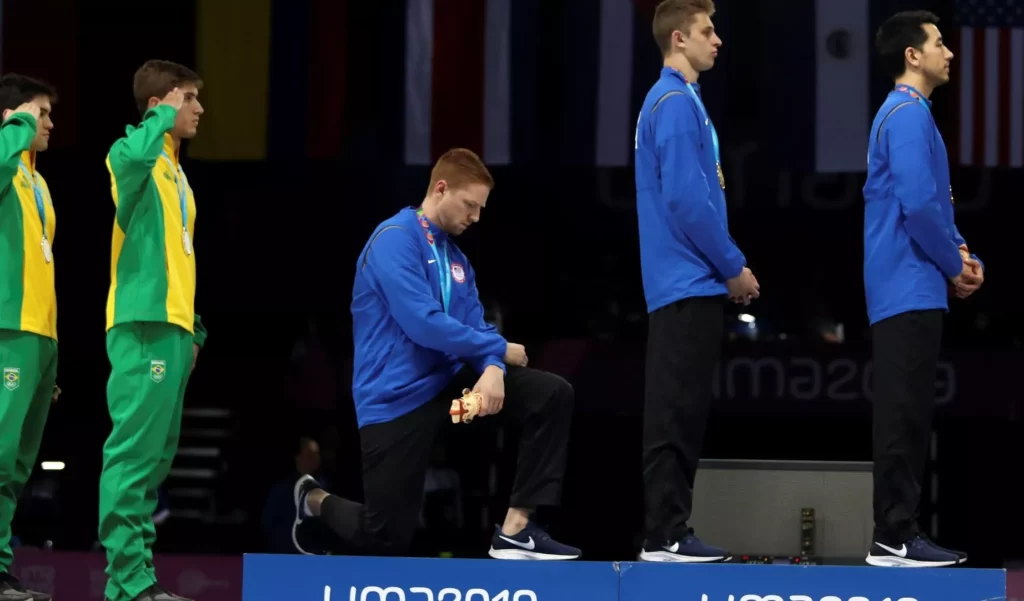 Durante las ceremonias de premiación en Lima, el esgrimista Race Imboden puso una rodilla en tierra, mientras que la lanzadora de martillo Gwen Berry alzó un puño.