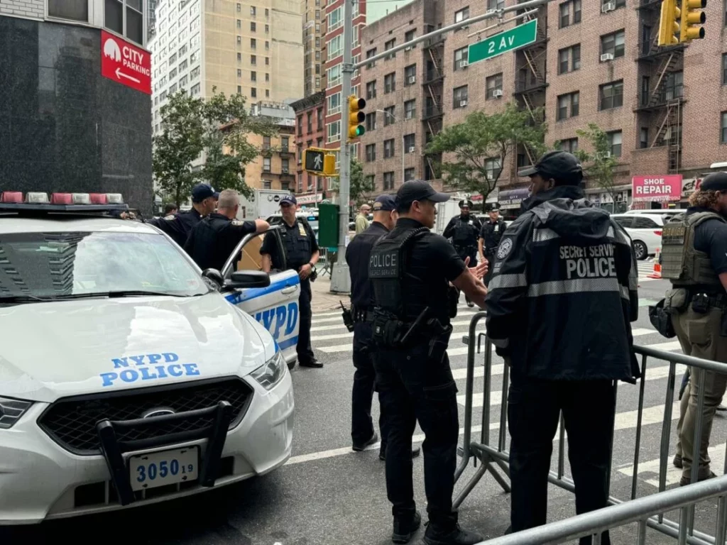 Agentes de la Policía de Nueva York y efectivos del servicio secreto restringiendo el acceso en la cercanía del edificio en el que se encuentran participando del encuentro mandatarios de todo el mundo, incluyendo el presidente de República Dominicana, Luis Abinader.