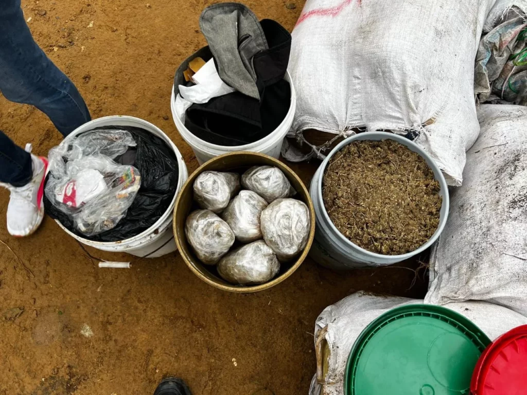 En el lugar también se recuperaron varias cubetas llenas del vegetal, así como tres celulares, RD $25, 200 pesos dominicanos, prendas de vestir, una cartera con documentos y otras evidencias.