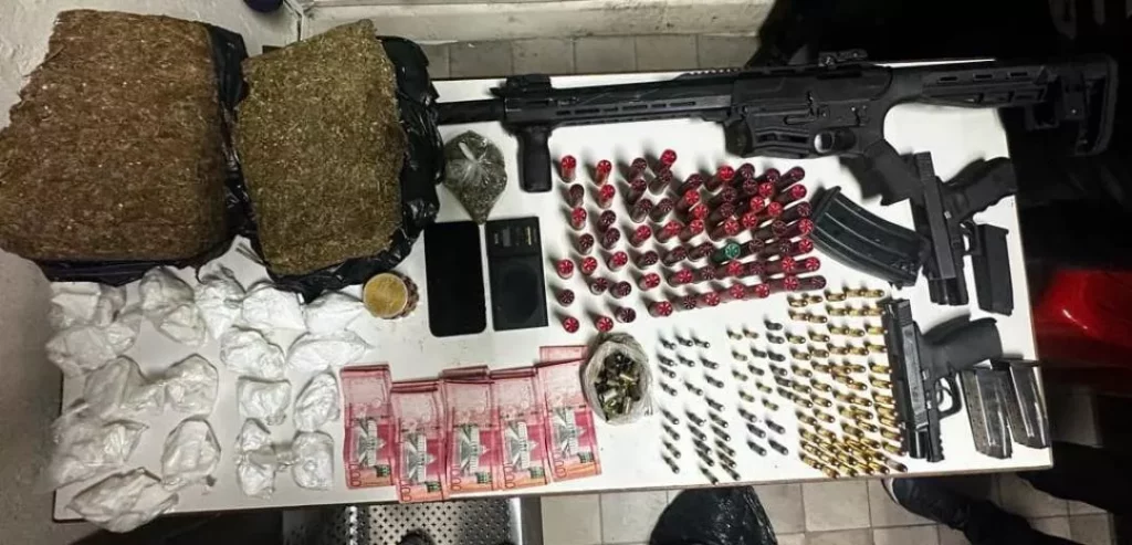 Los fiscales José Guillermo Guerrero Jiménez y Ángel Félix Recio conjuntamente con el coronel Robert Abreu de Jesús, subdirector regional de investigación de la Policía Nacional en San Cristóbal, el comandante de Investigaciones Antisecuestro y Extorsiones y miembros de la agencia antidrogas, así como equipos Swat y de Boina Gris e integrantes de la Policía Preventiva ocuparon las armas y las droga, así como dinero en efectivo, durante un allanamiento con la orden judicial 01541-2023-AJOA-01252 en una vivienda propiedad del apodado Kiko la Kema, localizada en el sector Río Arriba, del municipio Cambita Garabitos, de San Cristóbal.