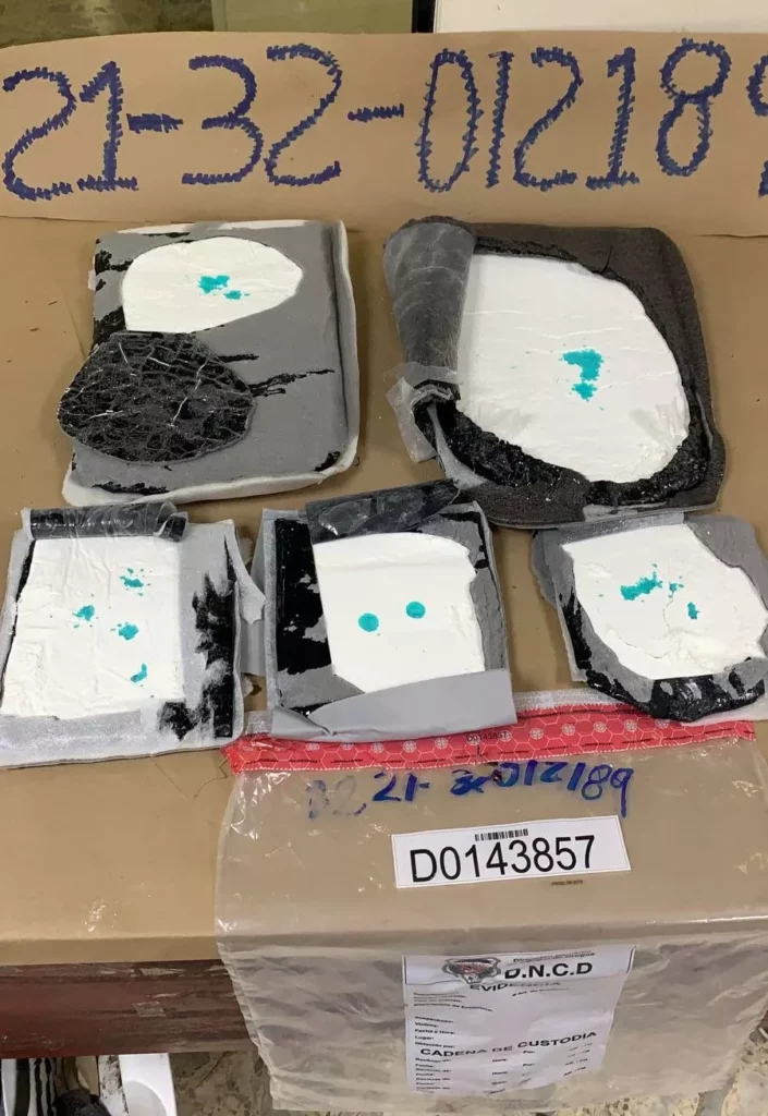 Indicó que tras realizar una revisión mas rigurosa, en la cartera de mano se incautaron tres láminas ocultas (en doble fondo) y otras dos en la mochila, cuyo peso total fue de 3.77 kilogramos de cocaína, según el análisis del Instituto Nacional de Ciencias Forenses (INACIF).