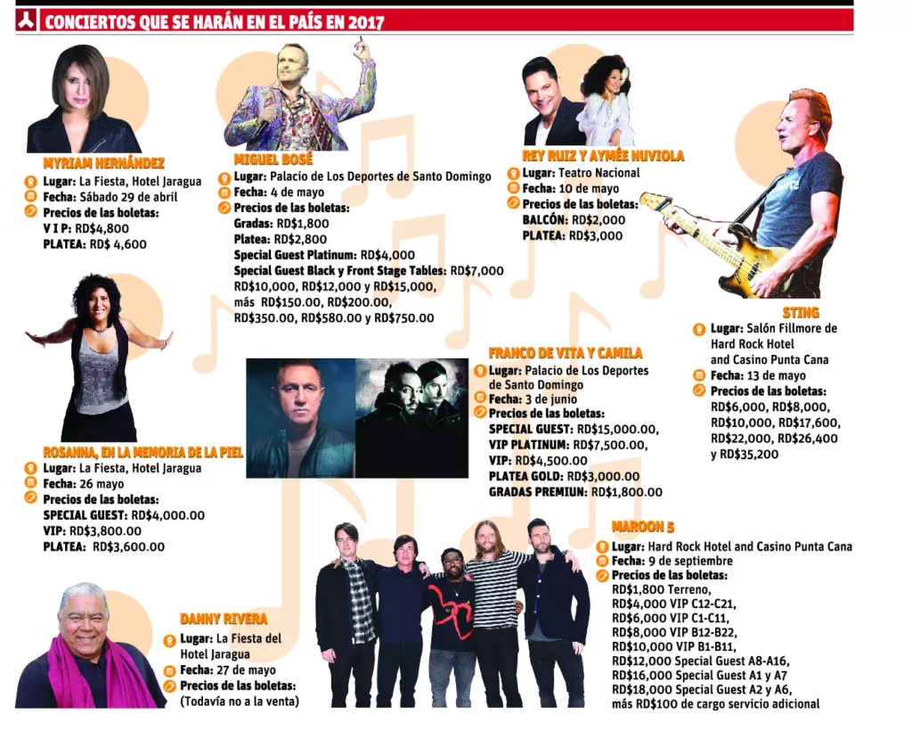Otros que incluyeron al país en sus giras son Maroon 5, Franco de Vita, Camila, Maluma, Rosanna, Myriam Hernández y otros más que serán anunciados más adelante.