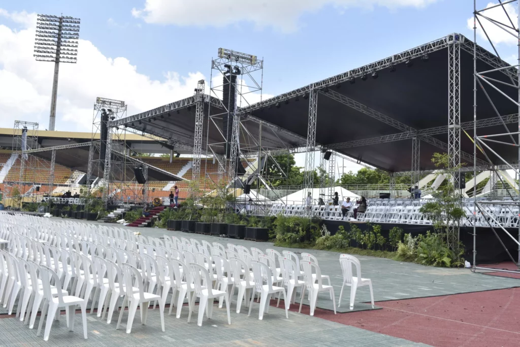 Toques finales a la tarima, colocación de sillas en todo el terreno, pruebas de sonido, entre otras labores eran realizadas desde tempranas horas de la mañana en el Estadio Olímpico Félix Sánchez, donde será trasladada la imagen de la Virgen, para le celebración del acto en el que se espera asistan al menos 60 mil personas.