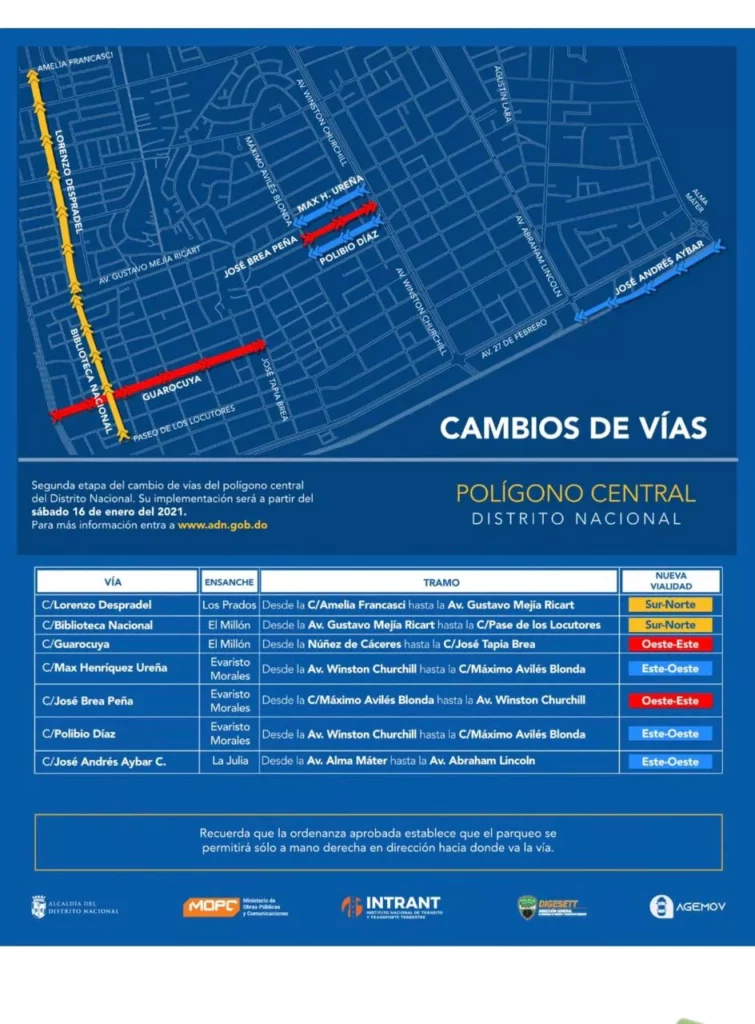 En esta oportunidad serán impactados los sectores de Los Prados, El Millón, Evaristo Morales y La Julia, donde han cambiado de sentido de dirección las calles Lorenzo Despradel de sur a norte, desde la calle Amelia Francasci hasta la Gustavo Mejía Ricart y en El Millón la Biblioteca Nacional desde la Mejía Ricart a la Paseo de los Locutores.