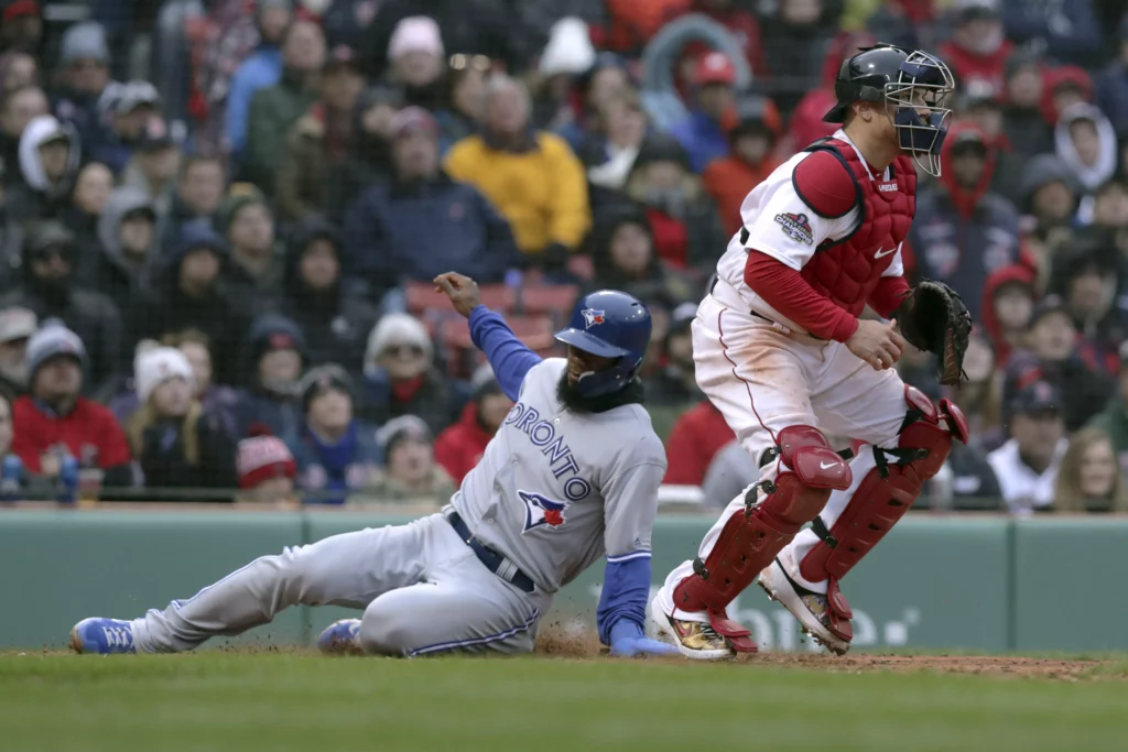 BOSTON.- Chris Sale permitió que un corredor de Toronto se robara el home, y los Azulejos derrotaron el martes 7-5 a los Medias Rojas de Boston para estropearles su primer juego de la temporada en el Fenway Park y su fiesta por la coronación en la última Serie Mundial.