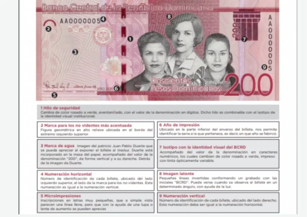 Santo Domingo.- El Banco Central de la República Dominicana informó que, a partir del miércoles 29 de septiembre de 2021, circulará un billete de RD$200.00 pesos dominicanos, serie 2020, que contendrá un nuevo hilo de seguridad.