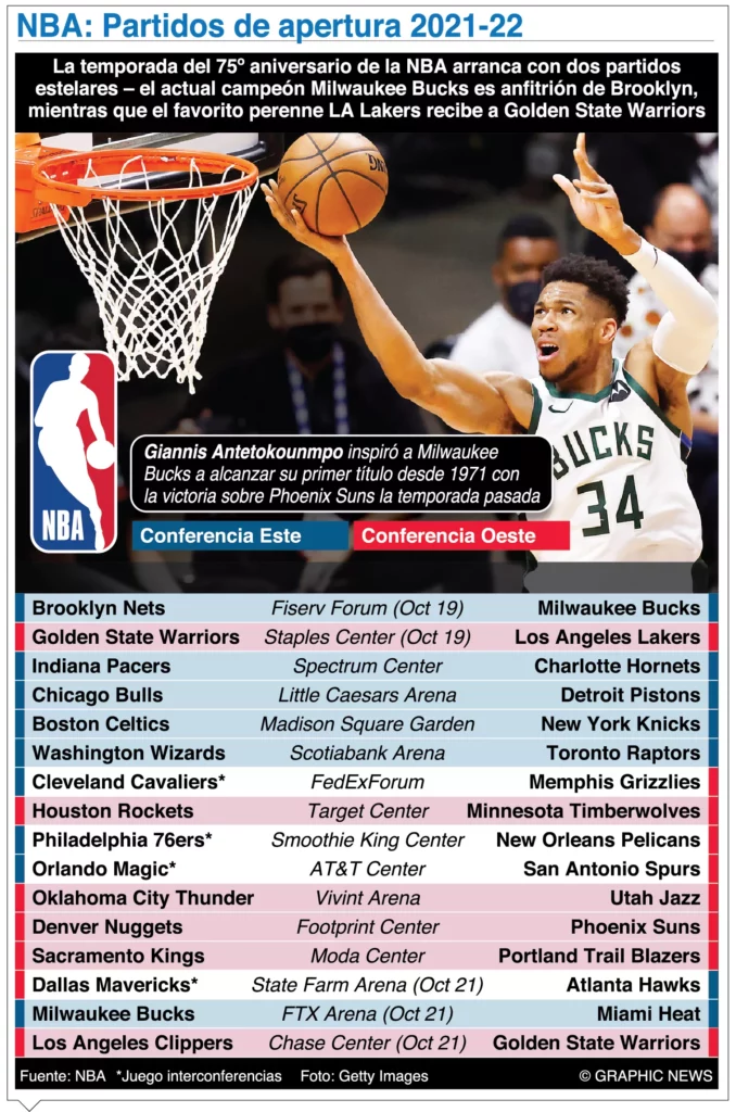 HOUSTON.-La septuagésima quinta temporada de la NBA comienza esta noche, con los Milwaukee Bucks, los últimos campeones, como el equipo a batir junto a los Phoenix Suns, los finalistas, frente a la incógnita que supone el rendimiento de Los Angeles Lakers, y su nuevo “Big Three”, o los Brooklyn Nets.